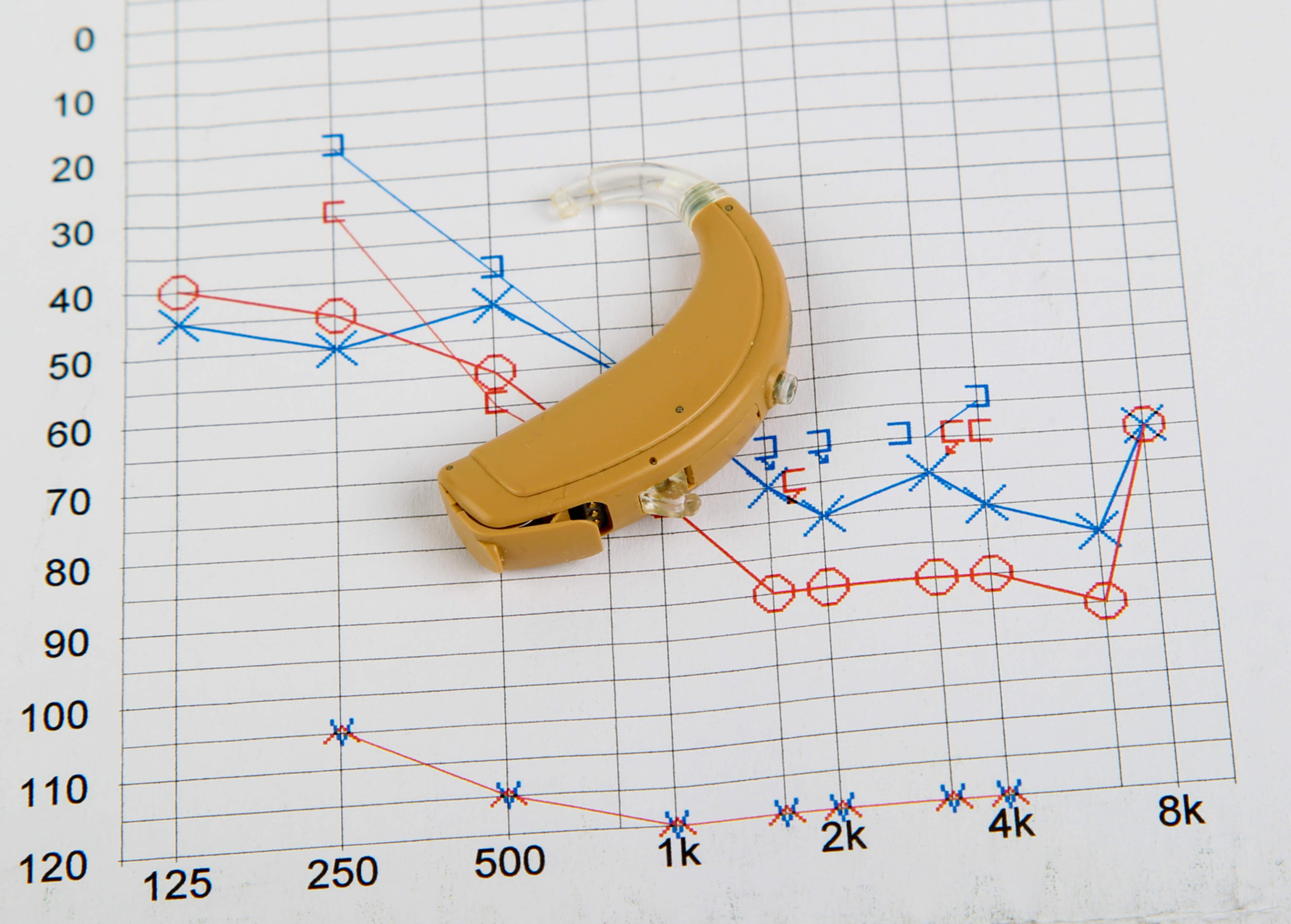 Vasemman korvan kuulokäyrä esitetään sinisillä ja oikean korvan punaisilla tunnusmerkeillä.