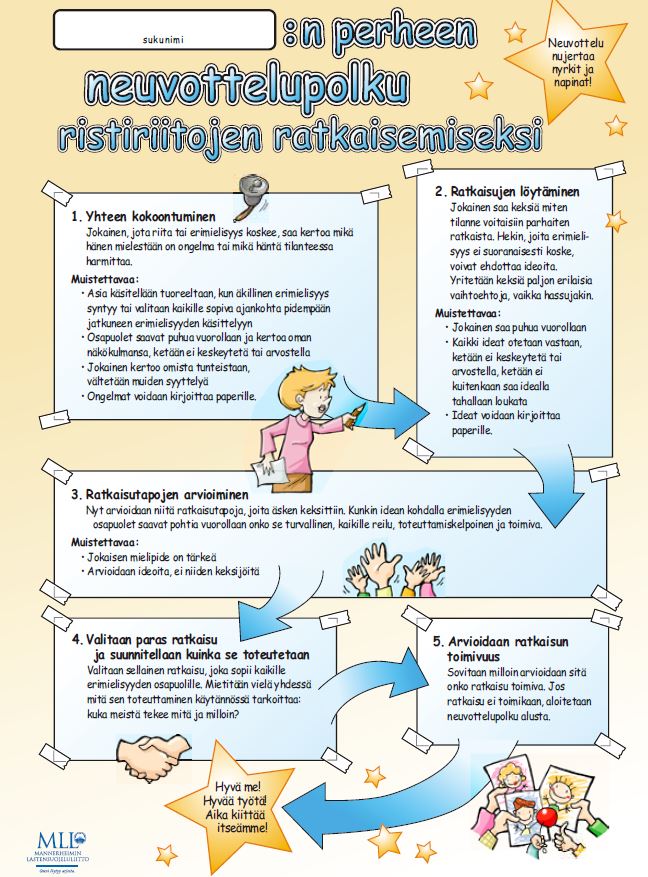 Toisaalta jokaisella perheellä on omat sääntönsä. Teidän perheen säännöt saavat olla erilaiset kuin kaverin perheen säännöt. Oman perheen sääntöjä kannattaa yhdessä miettiä ja sopia. Yksi tapa sopia säännöistä on järjestää kuvan mukainen perhepalaveri, jossa jokainen voi tuoda oman mielipiteensä esille ja lopuksi yhteisesti päätetään, miten meidän perheessä toimitaan.