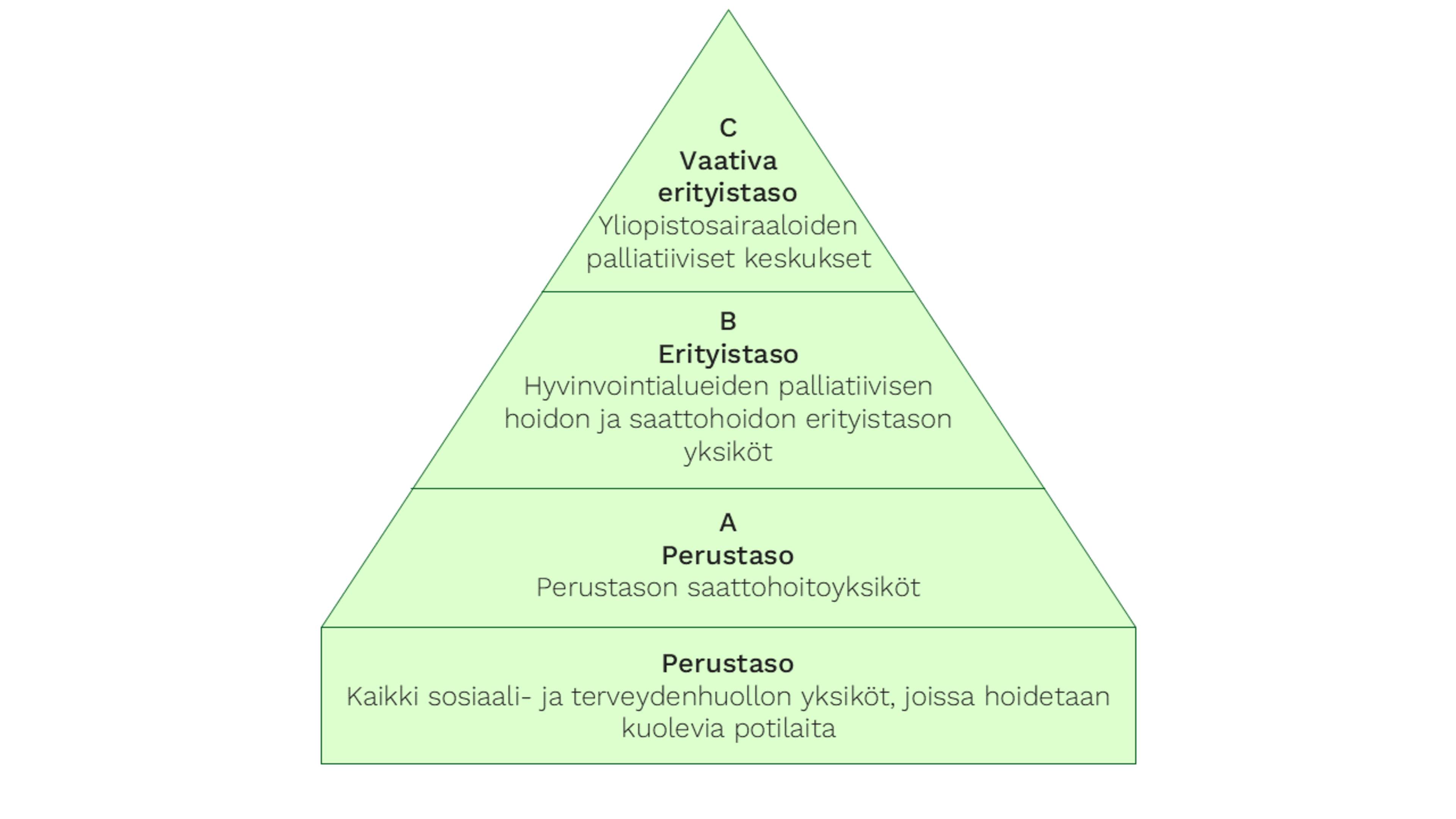 Palliatiivinen hoito on porrastettu tarvelähtöisesti osaksi nykyistä terveydenhuoltojärjestelmää. Palvelut on porrastettu perusosaamisen tason lisäksi kolmeen eri tasoon: