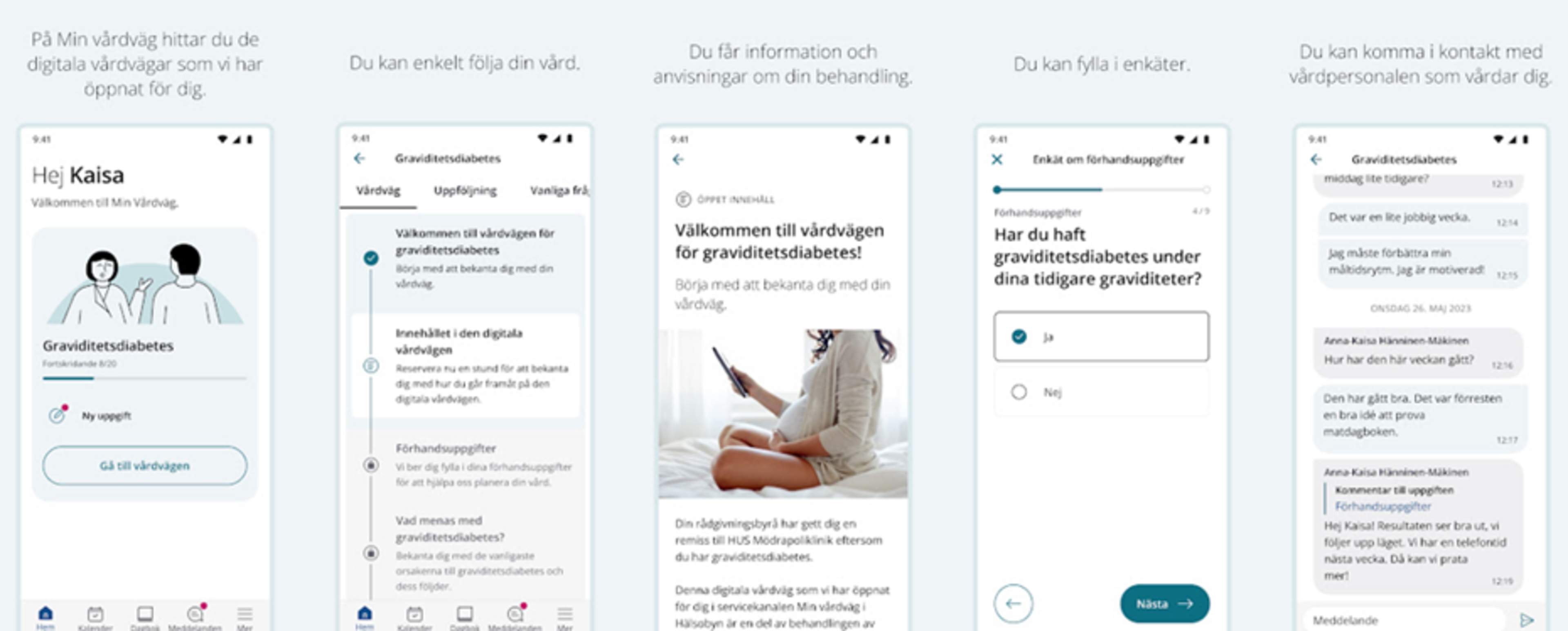 På vägen hittar du information om din vård eller äranden i form av text, bilder och videor, enkäter, övningar och anvisningar. Dina uppgifter visas alltid endast för de yrkespersoner som ansvarar för din vård eller dina ärenden.