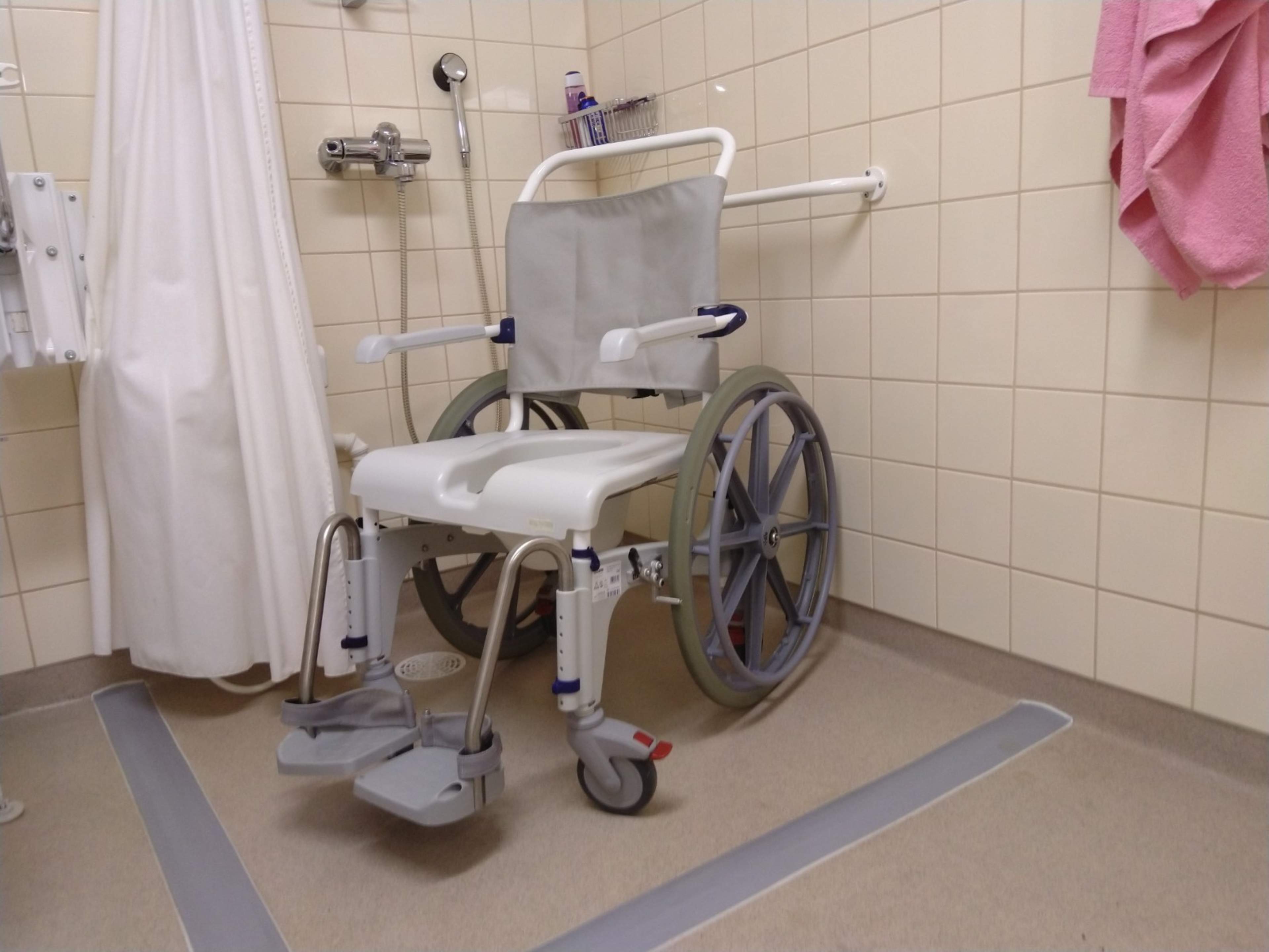 En duschstol med hjul gör det lättare att tvätta sig när det är svårt eller omöjligt att gå.